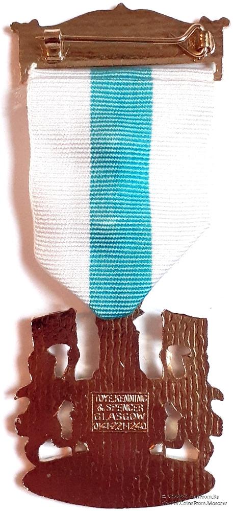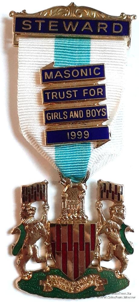 КОЛОДКИ/МЕДАЛЬОН: верхняя колодка прямоугольная, сверху с орнаментом и надписью STEWARD. В центре ленты медальон в виде витой ленты с наименованием благотворительного заведения и даты. (Masonic Trust for Girls and Boys 1999).