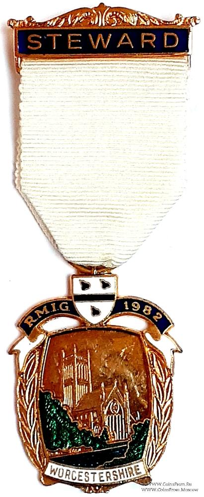 АВЕРС: в форме прямоугольника с выпуклыми сторонами, обрамлённого с боков венком. В центре изображения зданий. В нижней части знака на ленте наименование провинции - Worcestershire, — графство на западе Англии. В верхней части знака малый герб провинции в форме щита и лента с аббревиатурой благотворительного заведения и даты (RMIG 1982).