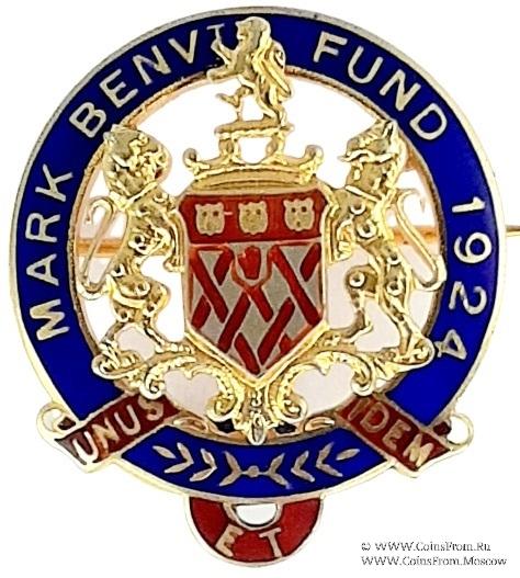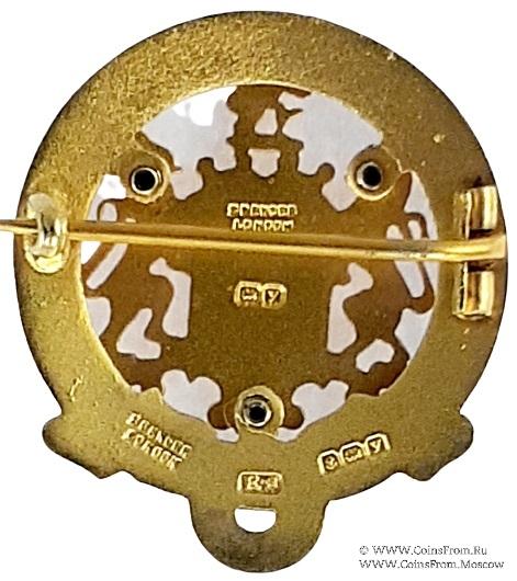 АВЕРС: двойной круг синей эмали с наименованием фонда и даты 1924. В центре герб в виде щита, двух щитодержателей, клейнода и девизной ленты красной эмали с надписью на латыни.