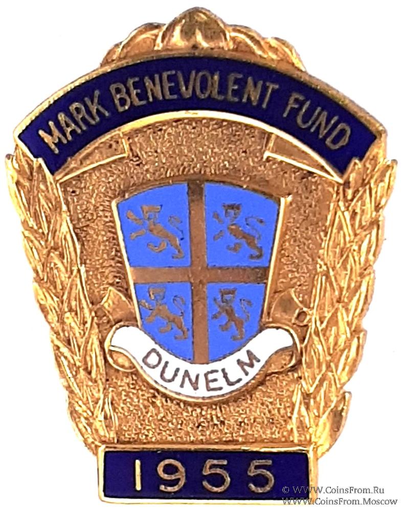 АВЕРС: изображение замкового камня голубой эмали разделённого на четыре части крестом. В каждой из частей изображение льва «на стороже» (геральд.). Ниже на белой ленте надпись Dunelm и ниже дата 1955. С боков венок из колосьев. Вверху знака на синей ленте наименование фонда - Mark Benevolent Fund.