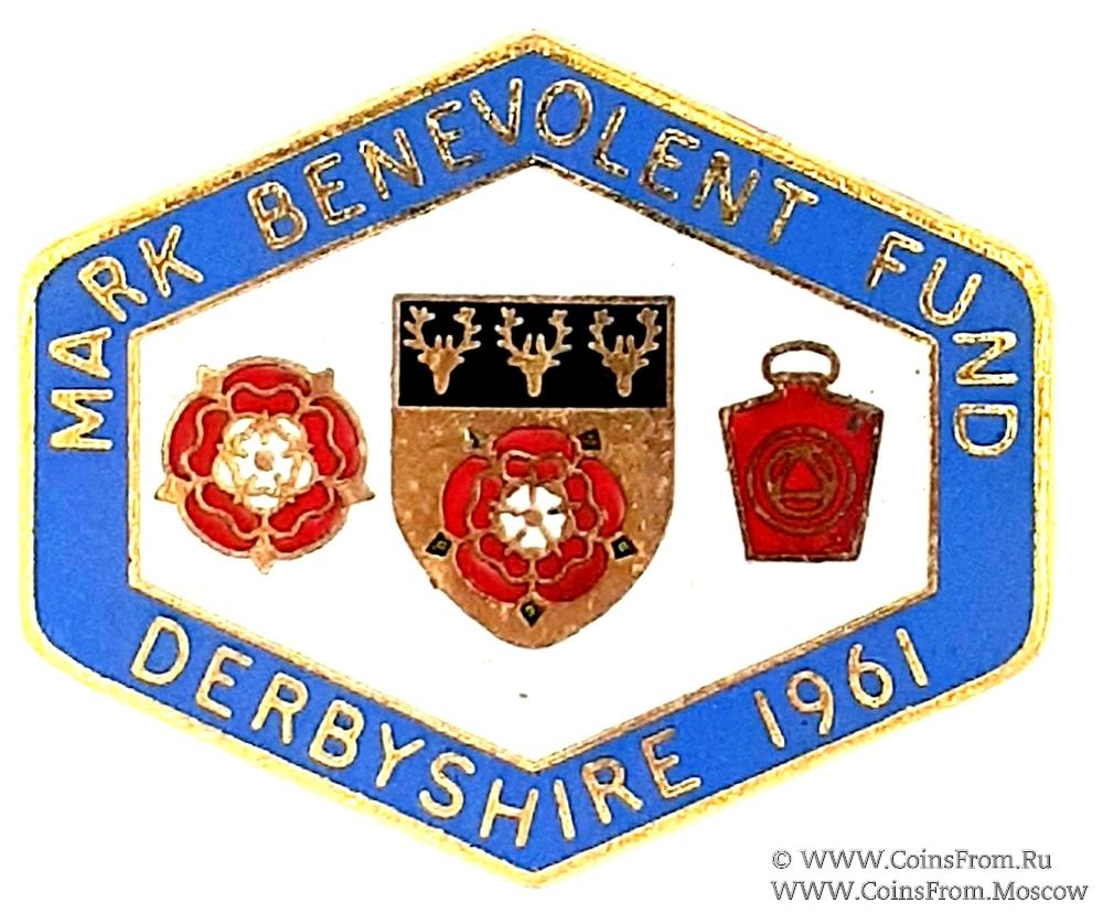 АВЕРС: в форме двойного шестиугольника. По двойному периметру наименование фонда, провинции и даты: Mark Benevolent Fund, Derbyshire (графство в центре Англии), 1961. В центре символика с герба графства и замковый камень символ Масонов Мастеров Метки.
