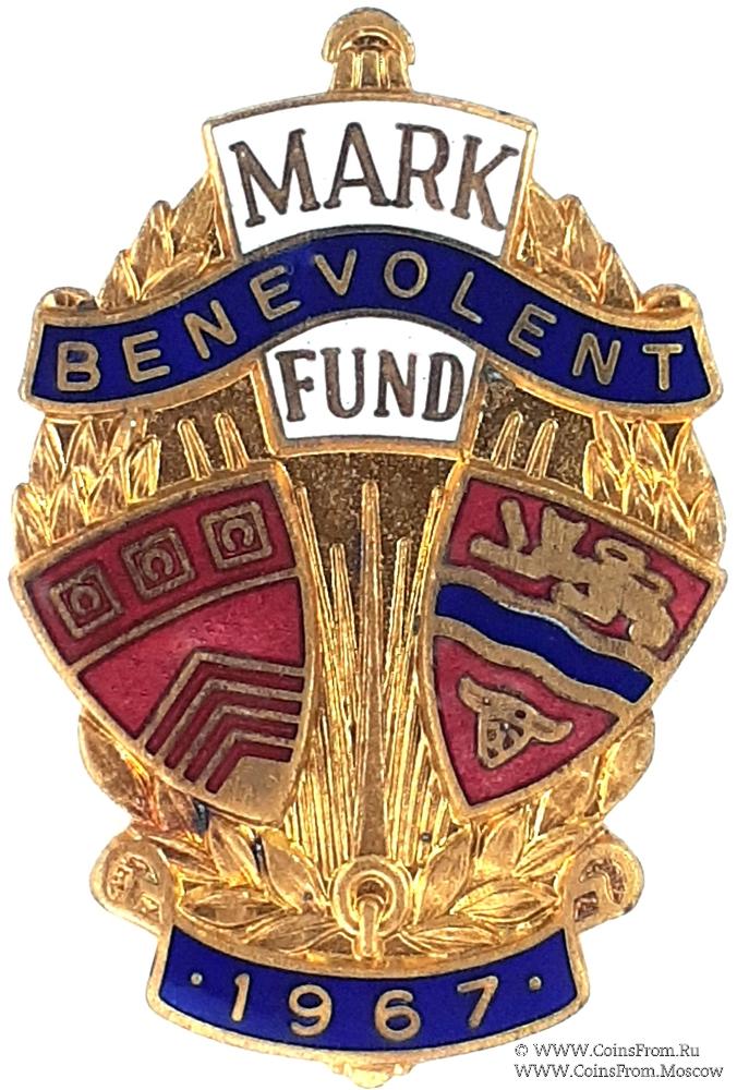 АВЕРС: Изображение двух малых гербов в виде щита на фоне растительного орнамента. В верхней части знака наименование фонда - Mark Benevolent Fund на замковом камне и ленте синей эмали. В нижней части дата 1967.