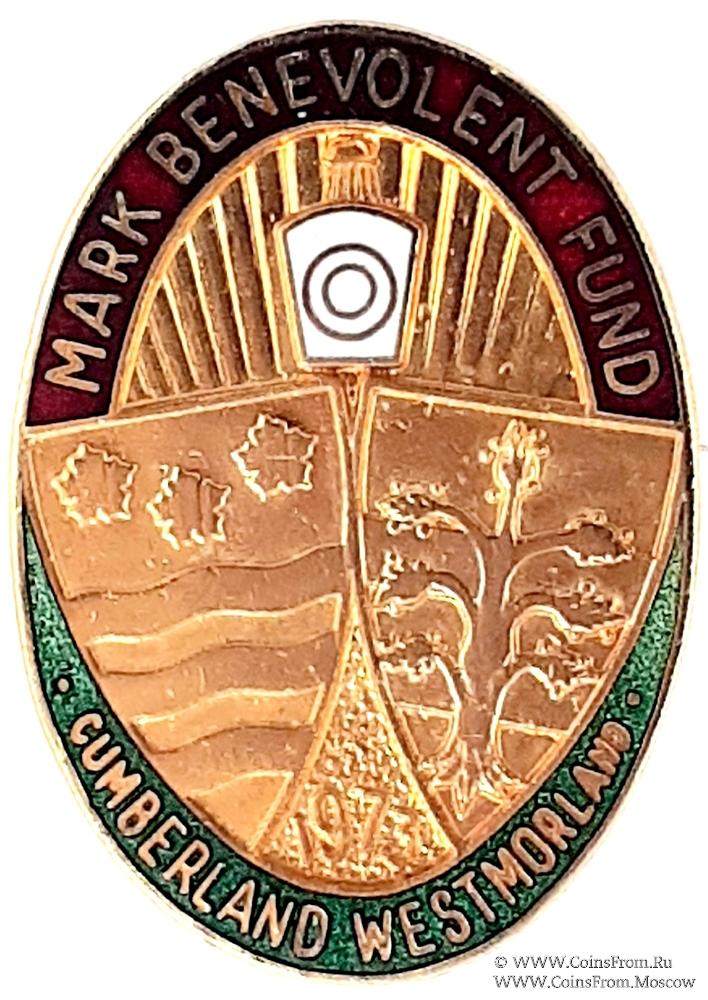 АВЕРС: овальной формы. В центре два малых герба, выше которых замковый камень на лучистом фоне. Внизу между щитами дата 1973. По верхней части овала наименование фонда - Mark Benevolent Fund. По нижней части – наименование провинции – Cumberland Westmorland (оба граф-ства с 1974 г. вошли в состав графства Камбрия (Википедия).