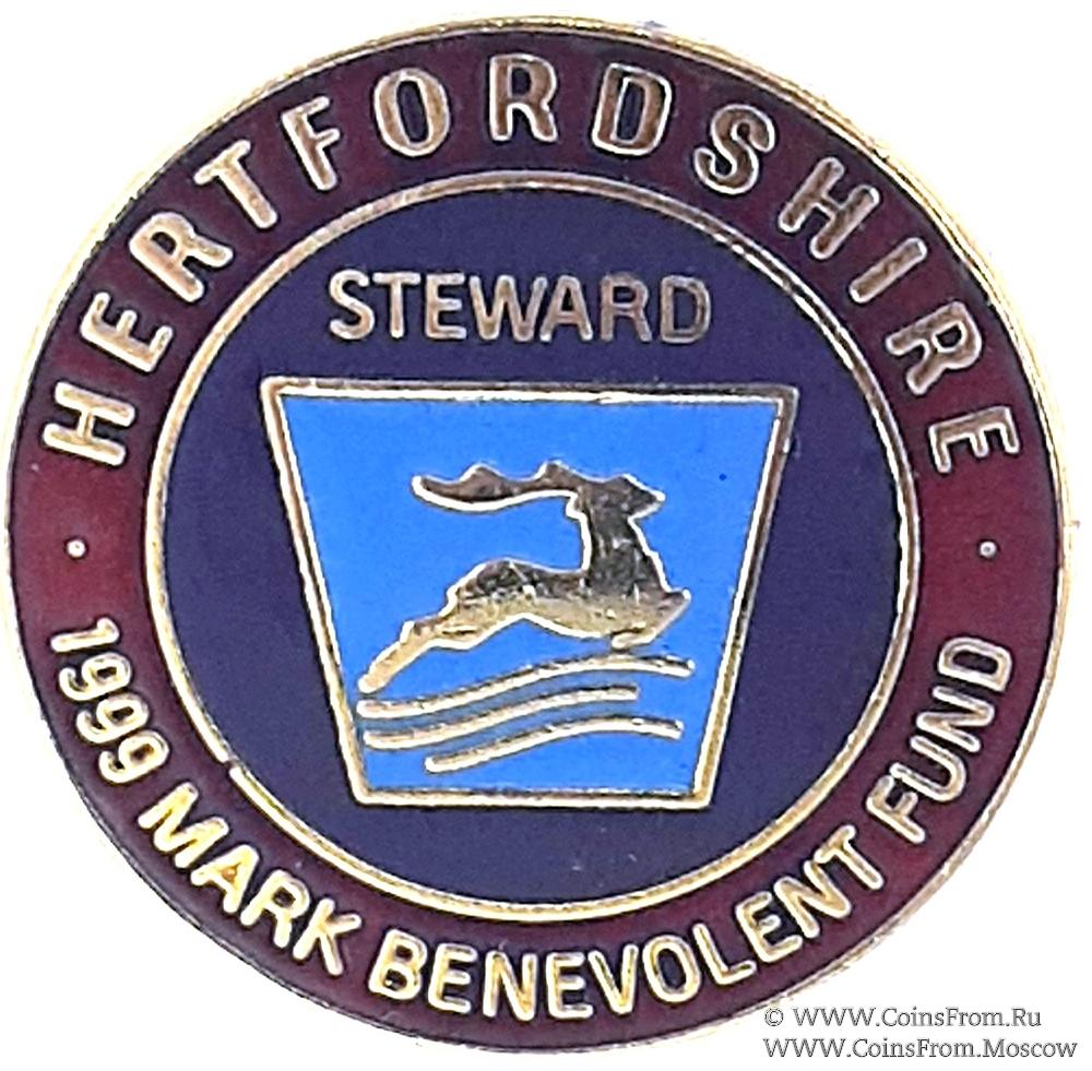 АВЕРС: двойной круг бордовой эмали с наименованием фонда (Mark Benevolent Fund), наименованием провинции Hertfordshire (графство в юго-восточной части Англии) и даты 1999. В центре знака замковый камень с изображением оленя (символ графства) и надписью над ним – Steward.