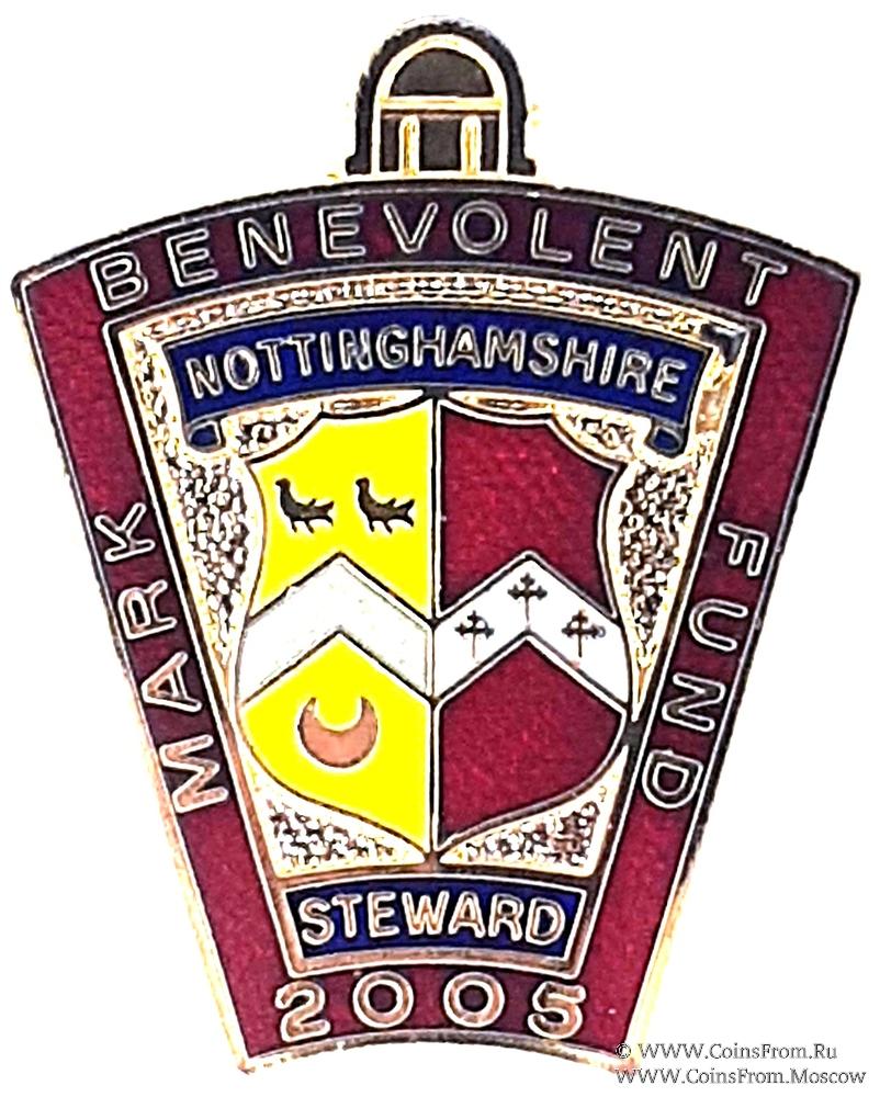 АВЕРС: в форме замкового камня с малым гербом в виде щита в центре. По периметру наименование фонда и дата Mark Benevolent Fund 2005. В нижней части надпись Steward, в верхней – наименование провинции – Nottinghamshire (графство в центре Англии).