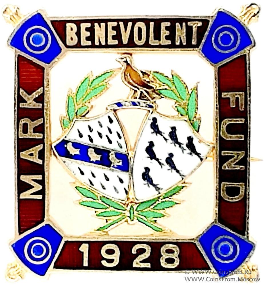 АВЕРС: в форме прямоугольника (высота на 2 мм больше ширины) из красной ленты с наименованием фонда и даты - Mark Benevolent fund 1928. В каждом углу изображён символический замковый камень. В центре два малых герба провинций в виде щитов на фоне венка. Правый с 6 птицами - Sussex — (графство на юге Англии). Оба щита соединены бурелетом, на котором изображение сидящей птицы.
