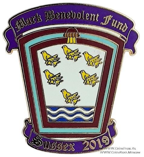 АВЕРС: в форме замкового камня с тройным силуэтом, внутри которого изображение символов провинции проведения благотворительного фестиваля. Верх и низ знака украшены лентами фиолетовой эмали. На верхней ленте наименование благотворительного фонда, на нижней – наименование провинции (Sussex) и даты 2019.