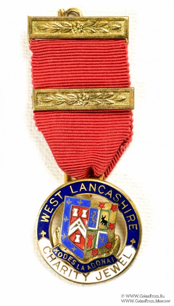 Знак двухслойный. Основа – круг сине-белой эмали вверху с названием провинции West Lancashire и названием знака на белом фоне Charity Jewel- благотворительный знак. В центре знака накладной малый герб Великой Ложи Англии в виде щита, ниже которого на ленте девиз: KODESLA ADONAI.
