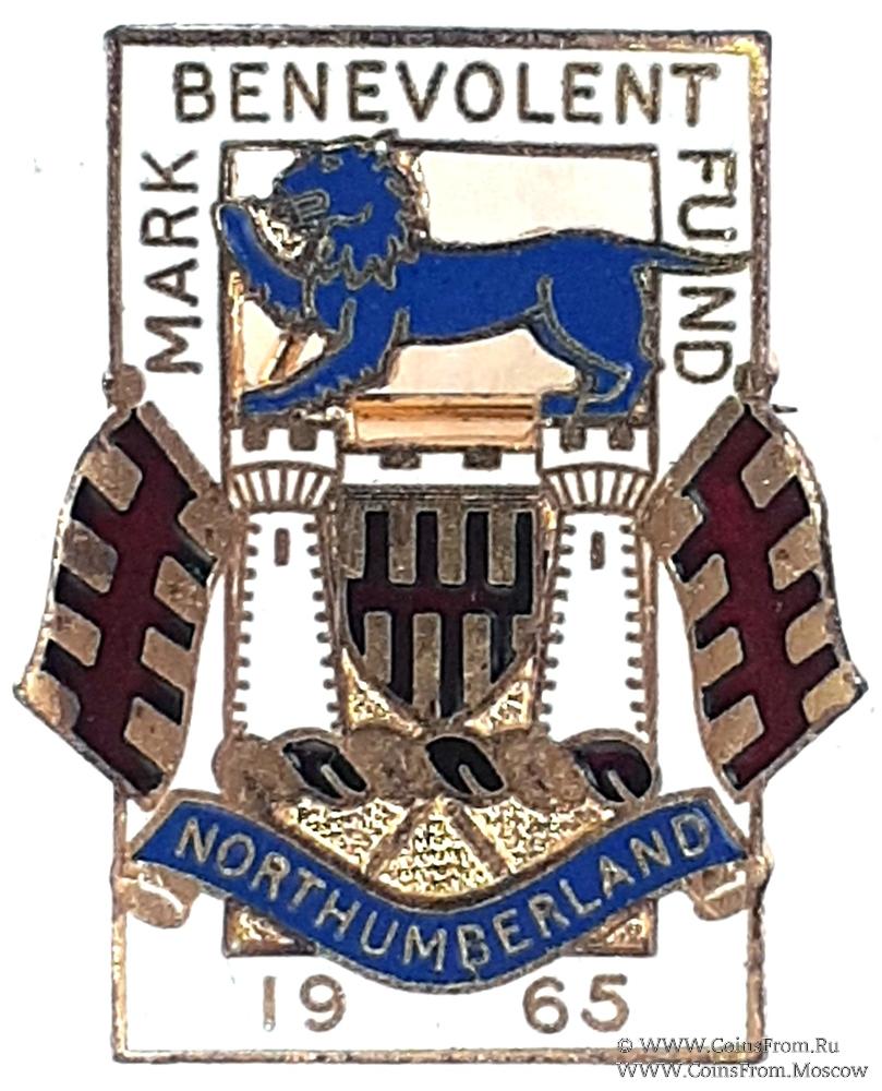 АВЕРС: прямоугольной формы. В центре две символические колонны с изображением на них идущего льва - символа Англии. Между колонн малый герб, по бокам флаг провинции Нортумберленд – (Графство на северо-востоке Англии). Под щитом ниже бурелета циркуль с лентой с названием провинции. На нижней стороне прямоугольника дата 1965. В верхней части прямоуольника наименование фонда MARK BENEVOLENT FUND.
