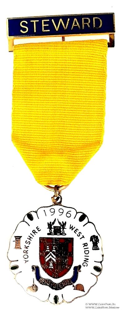 АВЕРС: в виде силуэта белой розы (белая роза Йорков – символ Йоркшира). В центре изображение малого герба Великой Ложи Англии, окружённой символами. Выше щита клейнод в виде двух ангелов с поднятыми крыльями, ниже щита лента с надписью. Вокруг щита наименование провинции Yorkshire West Riding – область графства Йоркшир.