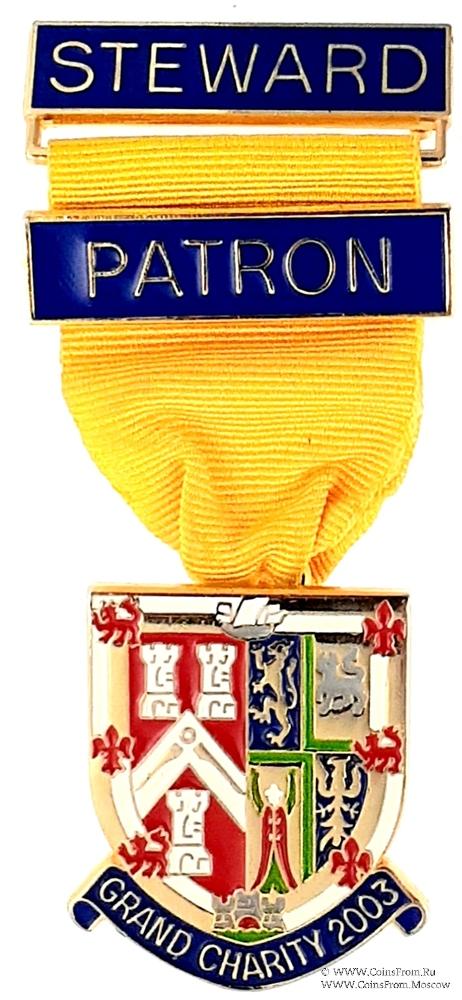 АВЕРС: в виде малого герба Великой Ложи Англии. Вокруг щита изображение символов в идее красного дракона (символ Уэльса), трилистника , крепостных башен. В нижней части знака на ленте наименование благотворительного фестиваля и дата (Grand charity 2003).