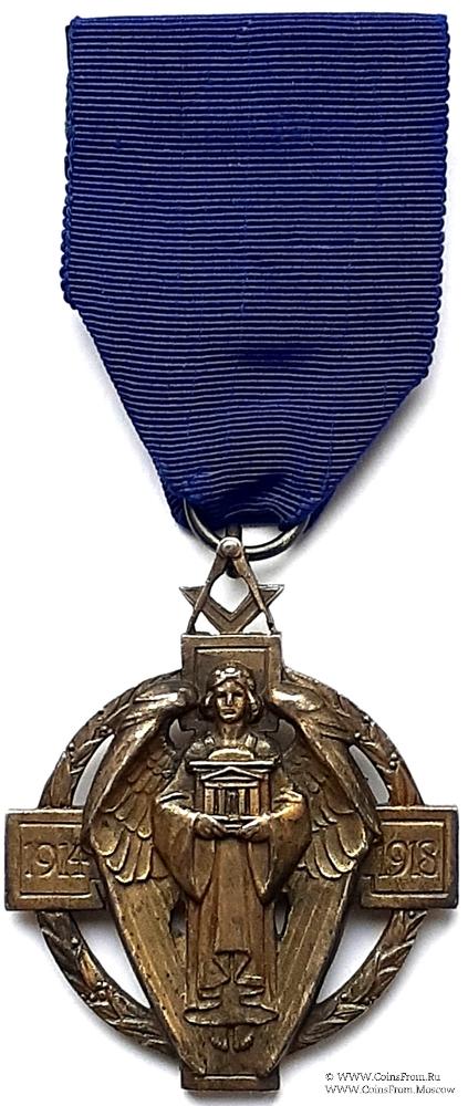 Аверс: в форме креста с венком, на фоне которого ангел, держащий изображение фасада будущего Дома Масонов. На верхнем луче наугольник и циркуль, к которому крепится кольцо для крепления ленты. На горизонтальных лучах надпись 1914 – на левом, и 1918 - на правом.