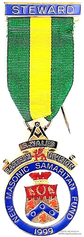 АВЕРС: двойной круг синей эмали с наименованием фонда и датой New Masonic Samaritan Fund 1999. В центре малый герб в виде увенчанного короной щита с символикой. Верх знака украшен красным драконом (символ Уэльса). Вокруг дракона размещена лента с наименованием провинции S.Wales и надписью Eastern Division (Северный Уэльс. Восточный дивизион). Верх ленты украшен циркулем с наугольником.