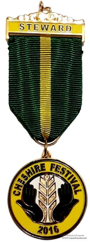 АВЕРС: двойной круг жёлтой эмали с наименованием провинции проведения фестиваля и даты – Cheshire Festival 2016. В центре на белом фоне изображение эмблемы фонда (две ладони и колос).
