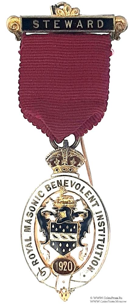 АВЕРС: овал из подвязки белой эмали с наименованием благотворительного заведения и даты (Royal Masonic Benevolent Institution). Верх овала увенчан короной красной эмали. В центре овала накладное изображение герба с намётом, шлемом и клейнодом. Ниже герба в красном овале дата 1920.
