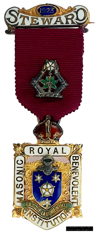 КОЛОДКИ/МЕДАЛЬОН: верхняя колодка в виде стилизованной ленты с надписью STEWARD и датой 1923 в синем овале. В центре ленты медальон с символикой.