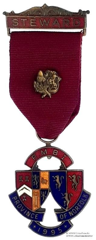 КОЛОДКИ/МЕДАЛЬОН: верхняя колодка прямоугольная с надписью Steward. Сверху колодка украшена орнаментом. В центре ленты медальон в виде дубовой ветки с жёлудем – эмблема RMBI.
