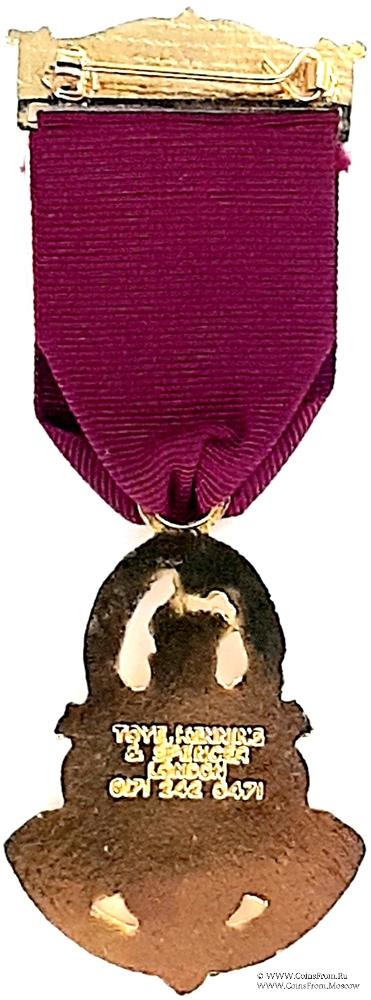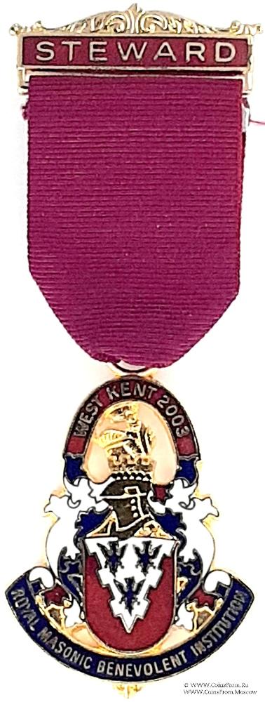 АВЕРС: в виде герба, состоящего из щита, шлема, нашлемника (коейнода), мантии. Сверху герба лента красной эмали с наименованием провинции и даты – West Kent 2003. На нижней ленте наименование благотворительного заведения – Royal Masonic Benevolent Institution.