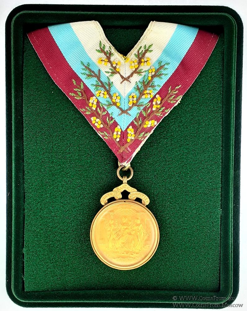 Реверс: слегка выпуклый с двумя щитами - элементами гербов. Справа щит герба Великой Ложи Ан-глии, слева часть герба Графства и графа Честер (этот титул с 1301 г. Присваивается только принцам Уэльским, наследникам английского престола). Ниже щитов на ленте с ветвями девиз ВЛА на латыни AUDI, VIDE, TACE – слушай, смотри и молчи. Сверху щитов в ветвях акации наугольник и циркуль. В углу наугольника 4 точки. Диаметр 40 мм. толщина – 8,6 мм.