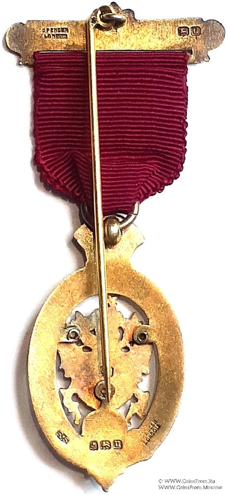 АВЕРС: овал из подвязки белой эмали с наименованием благотворительного заведения и даты (Royal Masonic Benevolent Institution). Верх овала увенчан короной красной эмали. В центре овала накладное изображение герба с намётом, шлемом и клейнодом. Ниже герба в красном овале дата 1920.