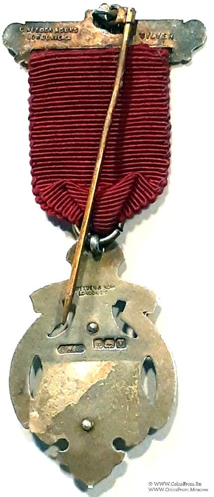 КОЛОДКИ/МЕДАЛЬОН: верхняя колодка в виде прямоугольника с надписью STEWARD. Верх колодки украшен изображением трилистника. С боков колодка украшена завитком, низ которого образует перекладину для ленты. Клейма: C.Weeden&Sons, London E. C. Silver.