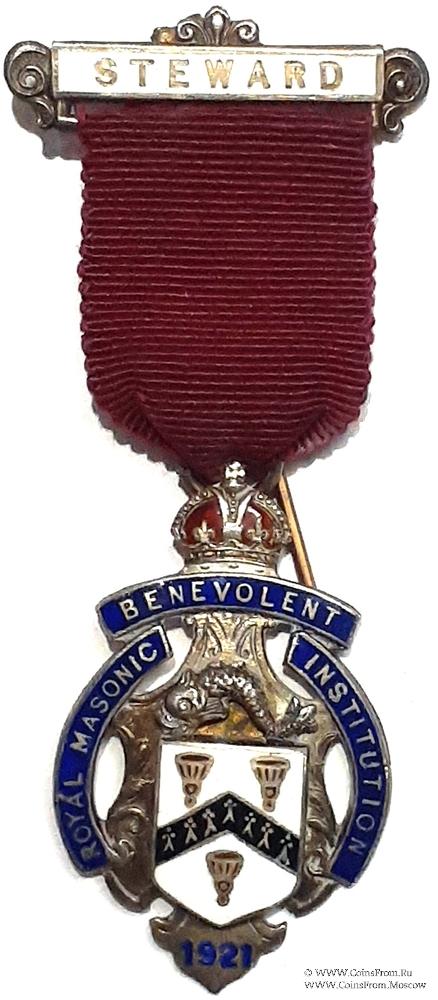 АВЕРС: в центре малый герб в виде накладного щита. В качестве клейнода объёмное изображение рыбы. Вокруг синяя лента с наименованием благотворительного заведения (Royal Masonic Benevolent Institution). В нижней части дата 1921. Верх знака увенчан короной красной эмали.