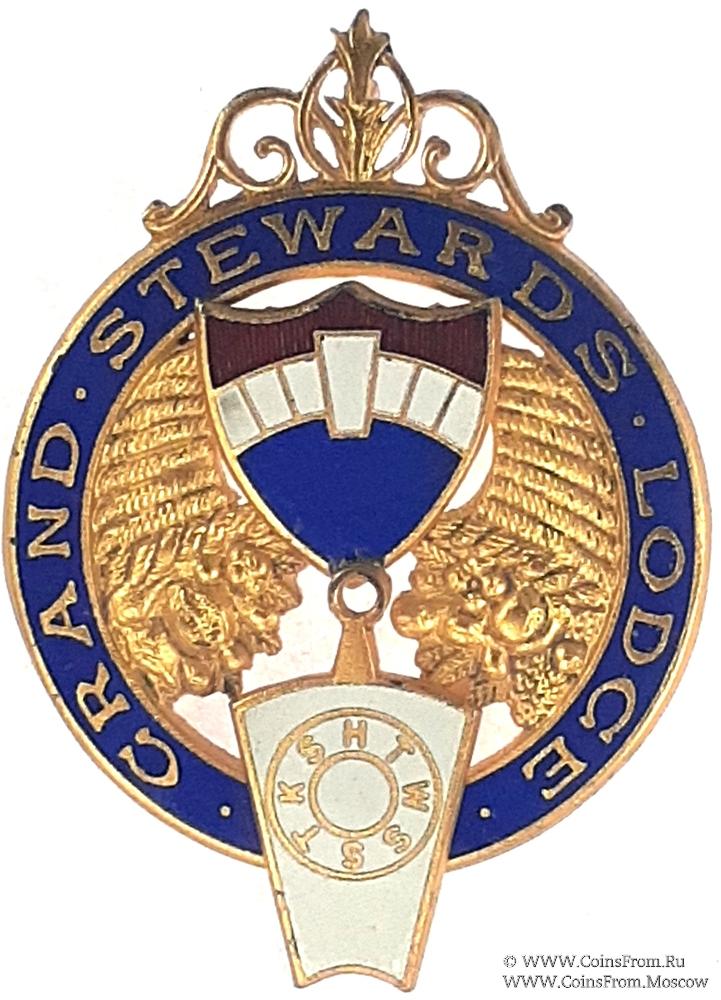 АВЕРС: двойной круг синей эмали с надписью Grand Lodge Steward. Внутри круга изображение двух символических рогов изобилия. В центре накладной щит с символикой Мастеров Метки с подвешенным замковым камнем. Верх украшен орнаментом.