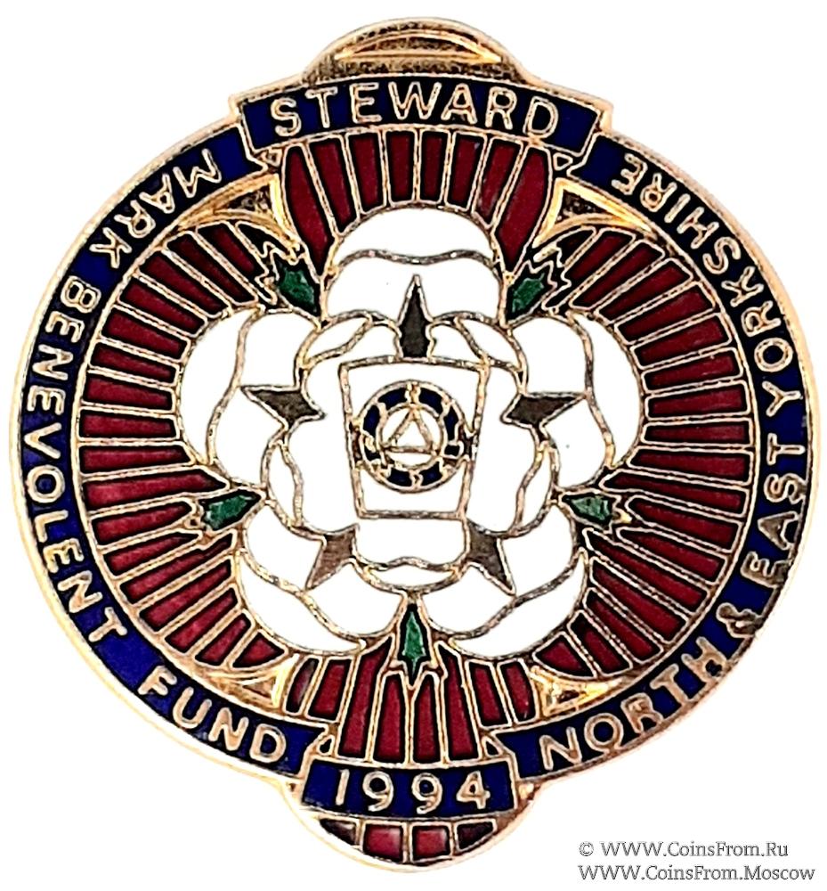 АВЕРС: по кругу лента синей эмали с наименованием фонда (Mark Benevolent Fund), надписью Steward, наименованием провинции (North & East Yorkshire) и датой 1994. В центре на фоне четырёх лепесткового красного цветка изображение символа графства Yorkshire «Белой розы Йорков». Центр розы украшен символическим замковым камнем.