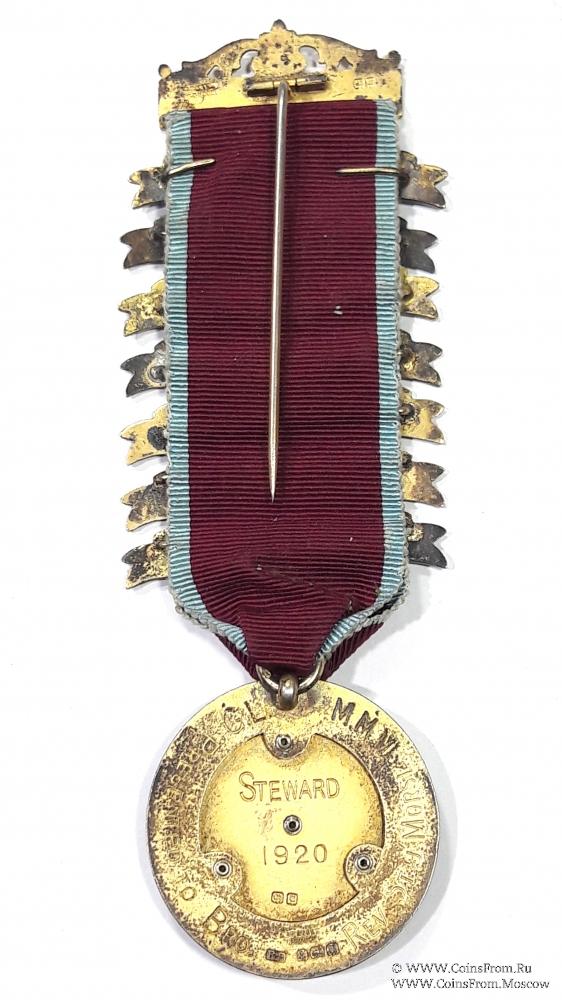 Надпись на реверсе: Presented to Bro. Rev. St. J. Morse G.L.M.M.M. Вручено Великой ложей Масонов Мастеров Метки. В центре надпись STEWARD 1920 - Преподнесён Брату Rev. St. J. Morse Великой ложей Масонов Мастеров Метки в 1920 г за благотворительность.