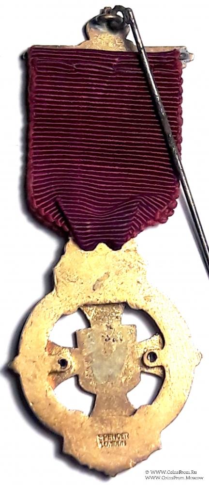 Знак в форме круга, образованного лентой синей эмали с белыми вставками, на которых написано наименование института ROYAL MASONIC BENEVOLENT INSTITUTION – Королевский Масонский Благотворительный институт и даты 1949. На ленте размещён накладной «лапчатый» (геральд) крест с малым гербом Великой Ложи Англии в центре.