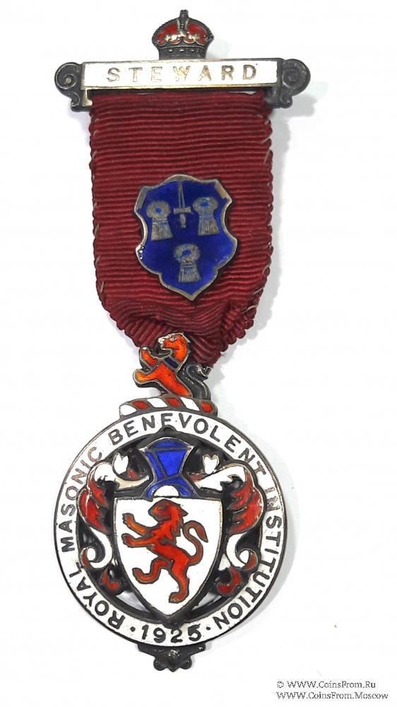 Знак трёхслойный. Основание знака кольцо белой эмали с названием института и датой ROYAL MASONIC BENEVOLENT INSTITUTION 1925, на котором на бурлете размещён клейнод в виде красного сидящего льва с синим венцом. Вторым слоем расположен красно-белый намёт. Верхний слой - щит с изображением красного льва на задних лапах, с размещённым на нём синим шлемом.