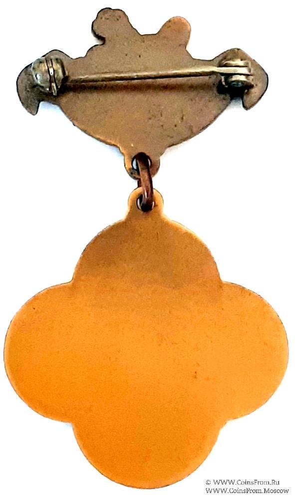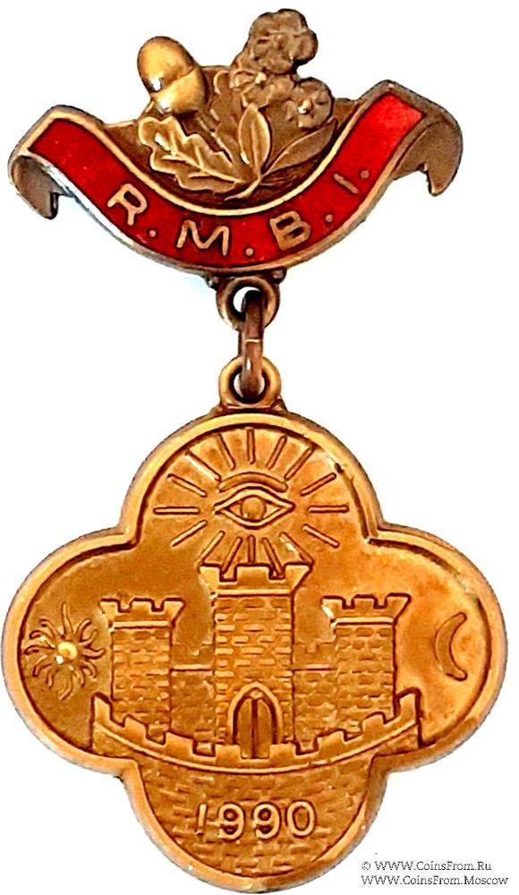 КОЛОДКИ/МЕДАЛЬОН: колодка в виде изогнутой ленты красной эмали с аббревиатурой благотворительного заведения – RMBI. Выше ленты цветы и жёлудь с листьями – элементы эмблемы RMBI.