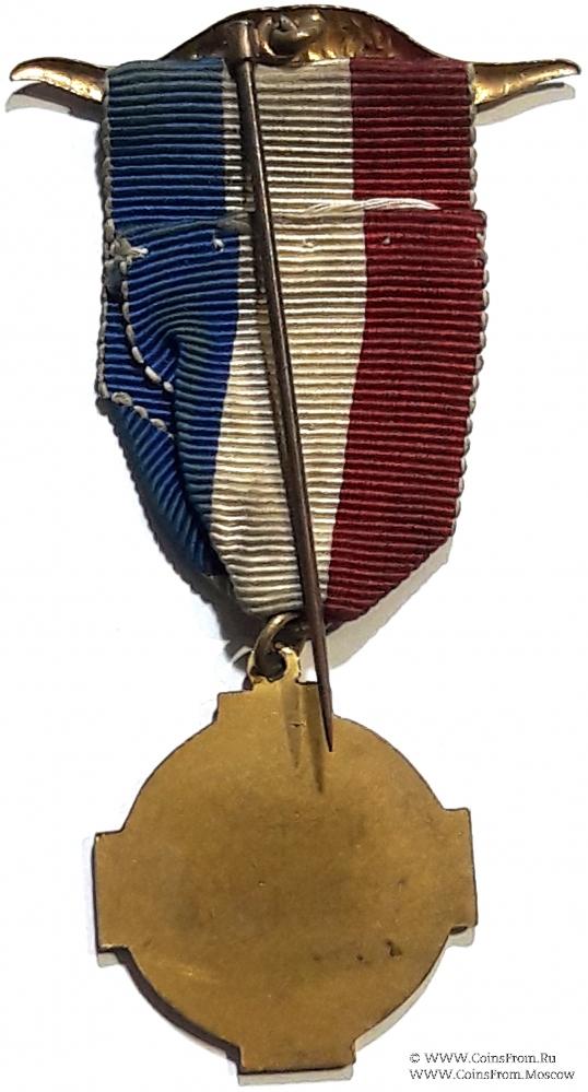 Лента сине-бело-красная. Верхняя колодка в форме рогов буйвола, с иглой для носки с обратной стороны.