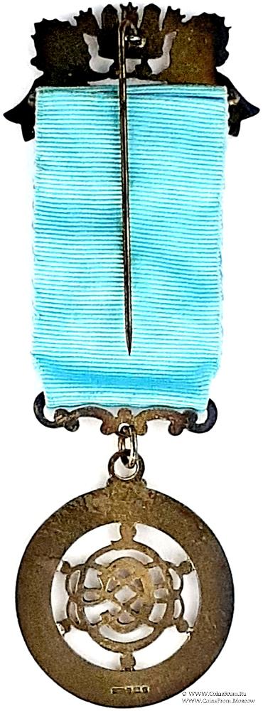 КОЛОДКИ/МЕДАЛЬОН: верхняя колодка в виде ленты с наименованием Ложи и якорями на концах. Сверху лента украшена двумя морскими коньками и короной между ними с символическими предметами. Нижняя колодка, витая с кольцом для знака. По центру ленты медальон жёлтого цвета с лентой голубой эмали и надписью номера Ложи № 2612. Второй медальон в виде венценосного льва на короне.