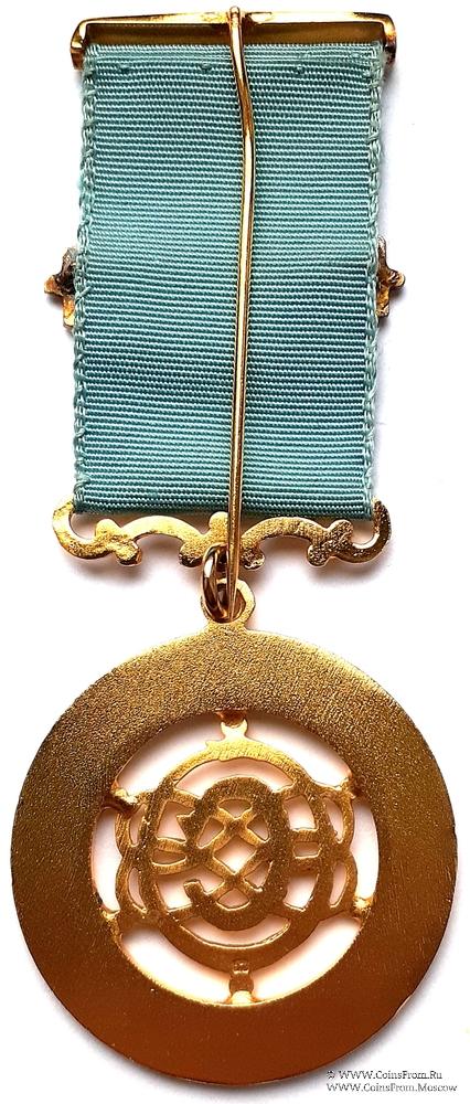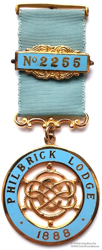 Колодки/медальон: верхняя - металлическая с иглой для носки. Нижняя - витая с кольцом для знака. По центру ленты медальон жёлтого цвета с лентой голубой эмали и надписью номера Ложи № 2255.