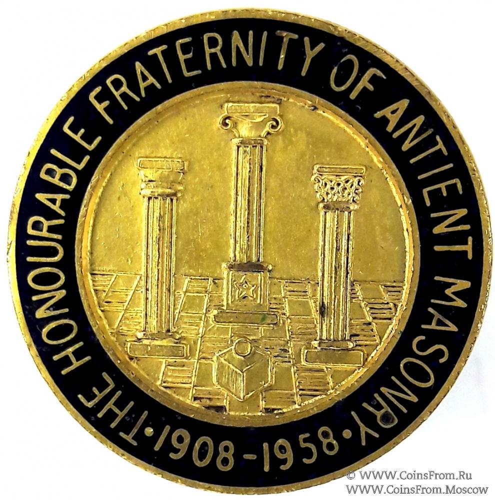 Знак круглой формы. В двойном круге чёрной эмали надпись на английском языке THE HONOURABLE FRATERNITY OF ANTIENT MASONRY - ДОСТОПОЧТЕННОЕ БРАТСТВО ДРЕВНBНИХ МАСОНОВ  1908 – 1958 - 50 лет.  В центре знака изображение Ложи с отдельными символами.. Мозаичный двухцветный пол, три колонны, символизирующие мудрость, силу и красоту.
