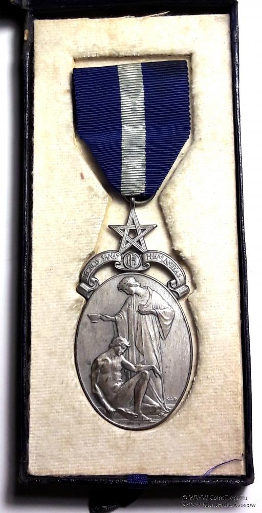Медаль овальной формы с рельефным изображением. Над знаком лента с надписью на латыни AEGROS SANAT HUMANITAS - Страждущих исцеляет Добродетель, по центру в круге вязь из 2 букв H F, над кругом пятиконечная звезда с кольцом для крепления на верхнем луче.