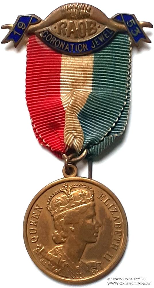 КОЛОДКИ/МЕДАЛЬОН: верхняя колодка полая, штампованная, в виде рогов буйвола c перекинутой лентой. Надпись на ленте: 1953 Coronation Jewel. Между лентой и рогами аббревиатура Ордена RAOB.