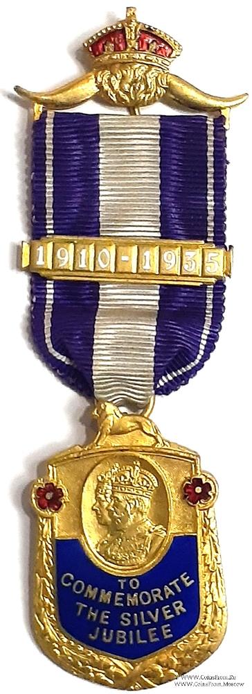 АВЕРС: в форме щита, снизу ограниченного венком из дубовых веток. Слева и справа щит украшен красными розами. Вверху размещено изображение льва. В верхней части щита овал с профильным изображением Короля Георга V и Королевы Марии. Ниже овала надпись: To Commemorate the Silver Jubilee (В память о серебряном юбилее).