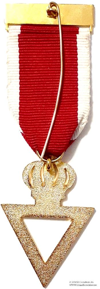 АВЕРС: в форме равностороннего треугольника белого цвета с вершиной, направленной вниз. Вверху треугольник увенчан короной, выполненной заодно с треугольником.