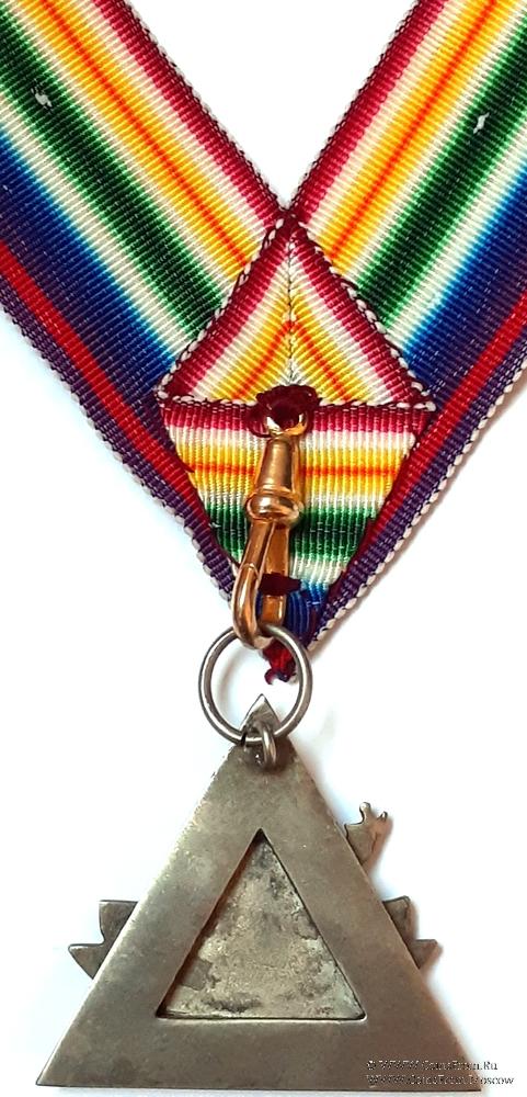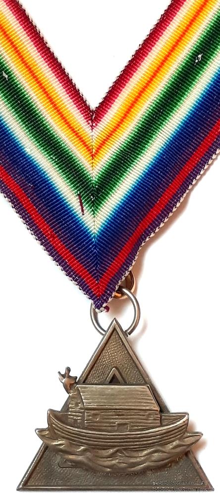 ЗНАК: основной металл. АВЕРС: в форме двойного равностороннего треугольника с размером стороны 45 мм. На двойном треугольнике изображён «Ноев ковчег». Изображение накладное. РЕВЕРС: без гравировок и клейм. КОЛОДКИ/МЕДАЛЬОН: нет. ЛЕНТА: объёмная для ношения на шее с чередующимися цветами радуги. На нижнем углу ленты карабин для крепления знака. Ширина ленты 32 мм.