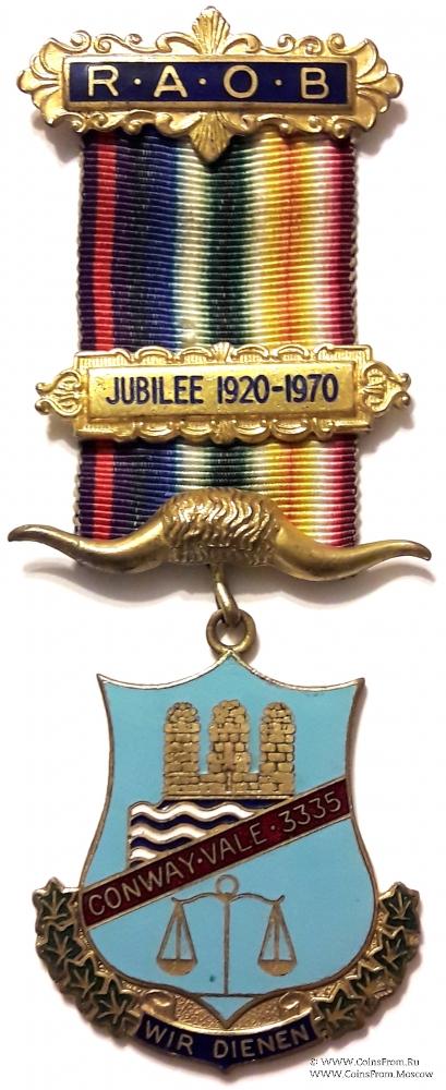 Лента с чередующимися цветами радуги. Верхняя колодка в виде ленты на фоне стилизованного орнамента с надписью RAOB. Нижняя колодка В виде рогов буйвола.