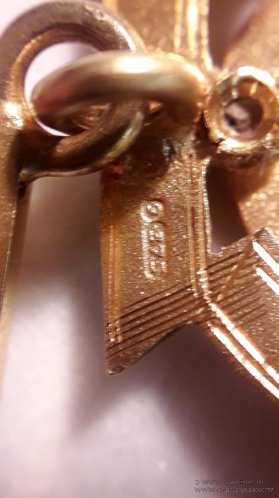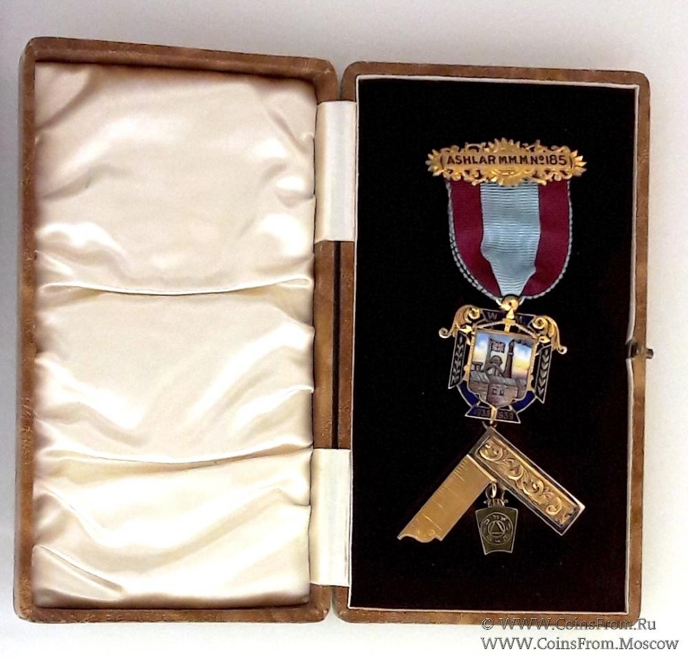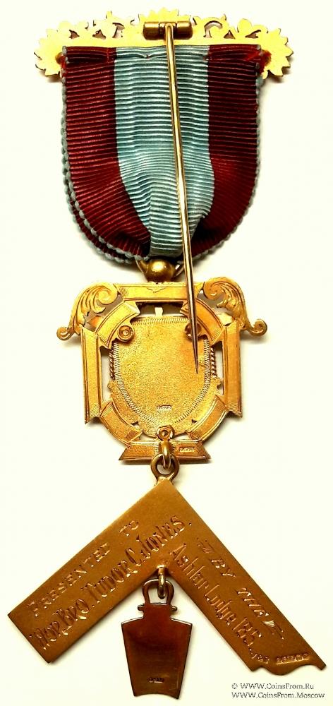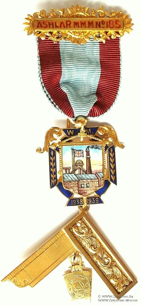 Знак Прошлому Досточтимому Мастеру Ложи Ashlar MMM № 185. Знак в форме медали с подвеской в виде наугольника и замкового камня. Одна из сторон наугольника с делениями в форме линейки, вторая утолщённая с орнаментом из листьев. Все элементы знака, включая кольцо, выполнены из золота, о чём свидетельствуют клейма производителя. Гравировка на реверсе знака: PRESENTED TO WOR. BRO. TUDOR C. JONES BY THE ASHLAR LODGE 185. Знак в форме щитообразного вымпела с картиной на эмали, изображающей завод с трубой и дымом и английским флагом на флагштоке. По бокам вымпела золотые шнуры с кистями. По сторонам вымпела трапециевидные пластины синей эмали с надписями и изображениями, образующие «лапчатый» крест. На боковых лучах креста символические изображения с одной стороны кукурузы, с другой – ветви акации. На верхнем луче буквы W.M.- уважаемый брат. На нижнем луче – даты 1938 – 1939.