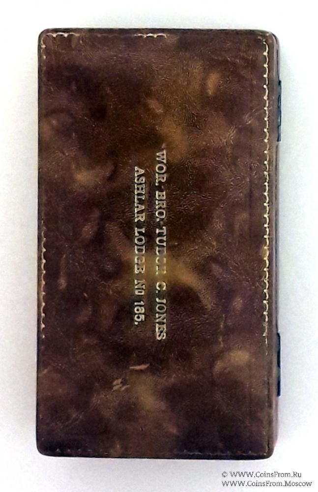Знак в «родной» коробке с выемками по форме подвесок в бордовом бархате. Внутренняя часть крышки отделана белым шёлком. С наружной стороны коробка обтянута кожей бежевого цвета с золотым тиснением, аналогичным гравировке на знаке - WOR. BRO. TUDOR C. JONES BY THE ASHLAR LODGE 185.