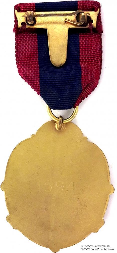 Лента синяя с бордовыми полосами по бокам. Верхняя колодка, скрытая с булавкой для носки. В низу лента непосредственно крепится к кольцу.