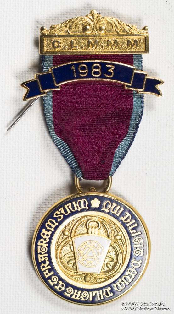 Лента знака бордовая с голубыми полосами по краям. На ленте перед верхней колодкой медальон в форме ленты синей эмали с датой 1983. Верхняя колодка с орнаментом наверху и надписью G.L.M.M.M. (Grand Lodge of Marc Master Masons-Великая Ложа Степеней Мастеров Метки).