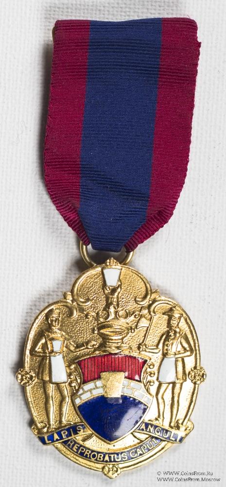 В центре знака в белой арке золотой проём под замковый камень на трёхцветном щите, сверху увенчанным шлемом рыцаря и короной, над которой в ладони замковый камень белой эмали. По бокам щита два масона в запонах белой эмали. Левый держит на ладони правой руки замковый камень белой эмали. Правый – в правой руке держит поднятый топор. В низу знака на ленте синей эмали надпись на латыни: LAPIS REPROBATUS CAPUT ANGULI (он есть) камень, пренебреженный вами зиждущими, но сделавшийся главою угла.