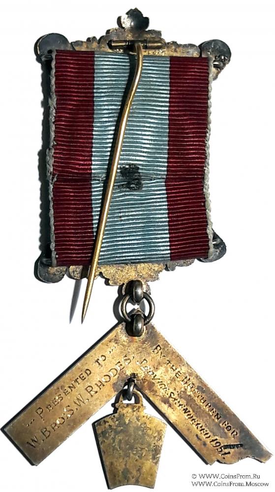 Реверс: гравировка: Presented to W.Bro.Rhodes by the Brethren for Services Rendered 1951 Вручён уважаемому Брату Rhodes братьями за услуги, оказанные в 1951 году. Клеймо: на наугольнике SILVER.