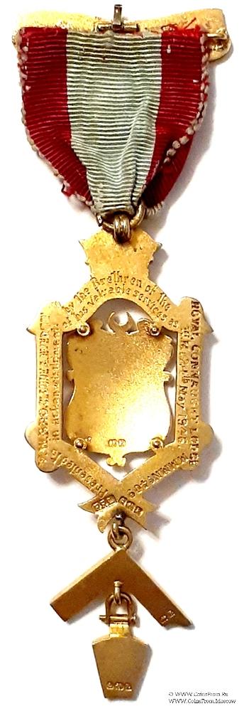 РЕВЕРС: клейма на щите – лев, Е, на шестиугольнике из ленты – FFL, якорь, лев, Е, на наугольнике – лев, Е, на подвеске – якорь, лев, Е, на колодке – лев, Е. Гравировка на ленте: Presented to YW. Bro. Claude A. Everitt in Acknowledqment by the Brethren of the Royal Connaught Lodge MMM № 409 of his Valuable Services as W.M. 24th may 1946 – Представленный Уважаемый Брат Братан. Claude A. Everitt в знак признания братьями Королевской ложи Коннот Масонов Мастеров Метки № 409 его ценных заслуг в качестве Досточтимого Мастера 24 мая 1946 года.