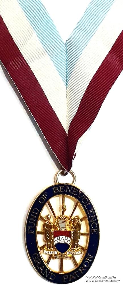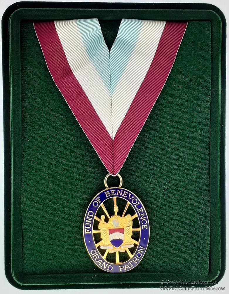 АВЕРС: овальной формы. В центре герб Мастеров Масонов в виде щита с двумя щитодержателями, стоящими на девизной ленте. Верх щита украшает шлем, увенчанный «стеновой» короной, на которой в качестве клейнода размещено изображение поднятой руки с замковым камнем. Надпись на девизной ленте на латыни: Lapis Reprobatus Caput Anguli. Надпись по синему овалу: Fund Benevolence. Grand Patron.